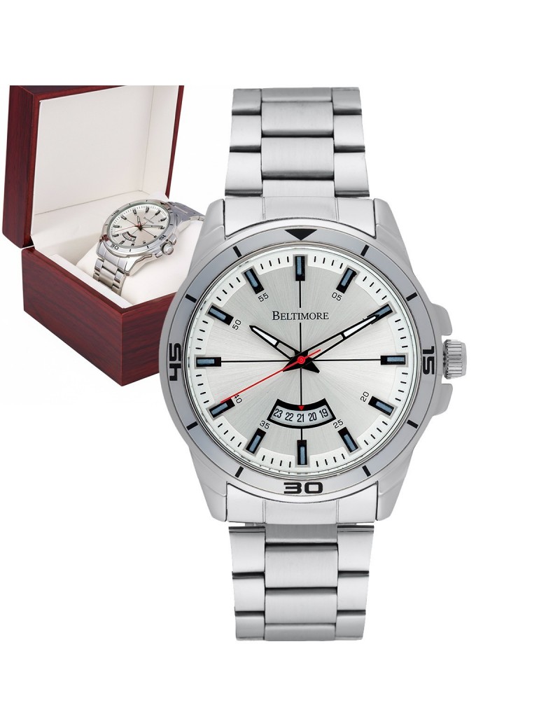 Zegarek męski bransoleta duży solidny srebrny z datownikiem premium Beltimore BT03