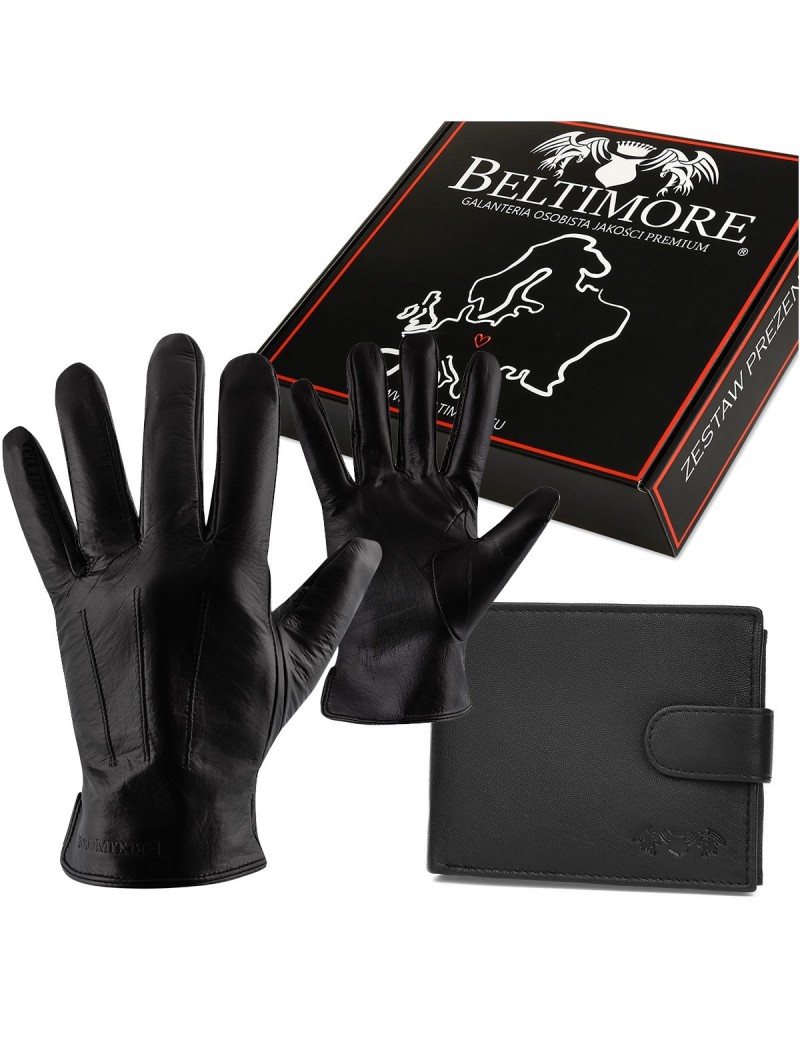 Zestaw męski skórzany portfel poziomy rękawiczki czarne Beltimore T84